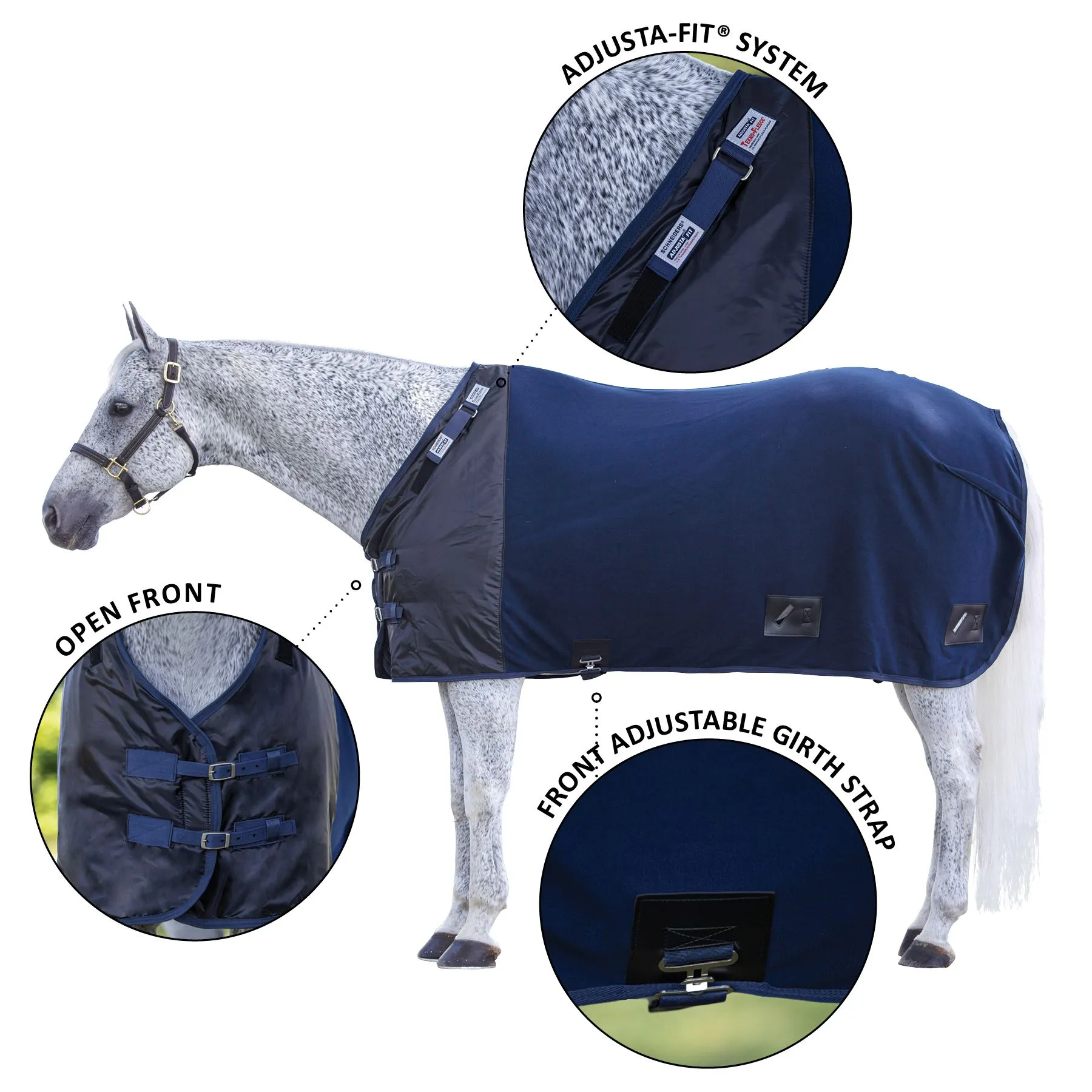 The Adjusta-Fit® Open Front Fleece Leg Strap Liner is an excellent sheet liner option that wicks moisture ensuring horse stays warm and dry. This liner provides warmth with minimal bulk and is the perfect option for in the stall, trailering, layering or on walker. An excellent anti-sweat sheet for after winter competition.