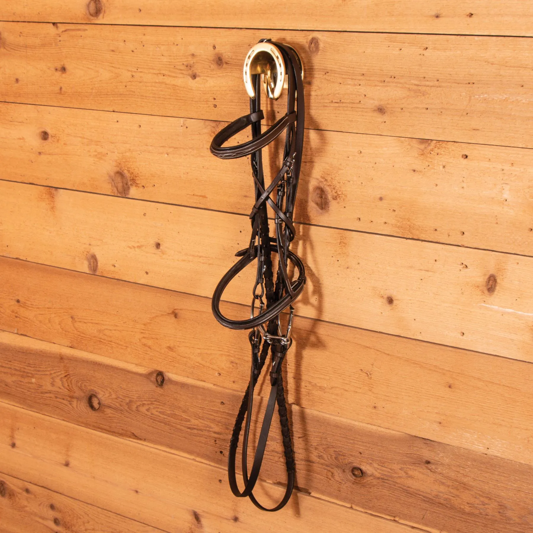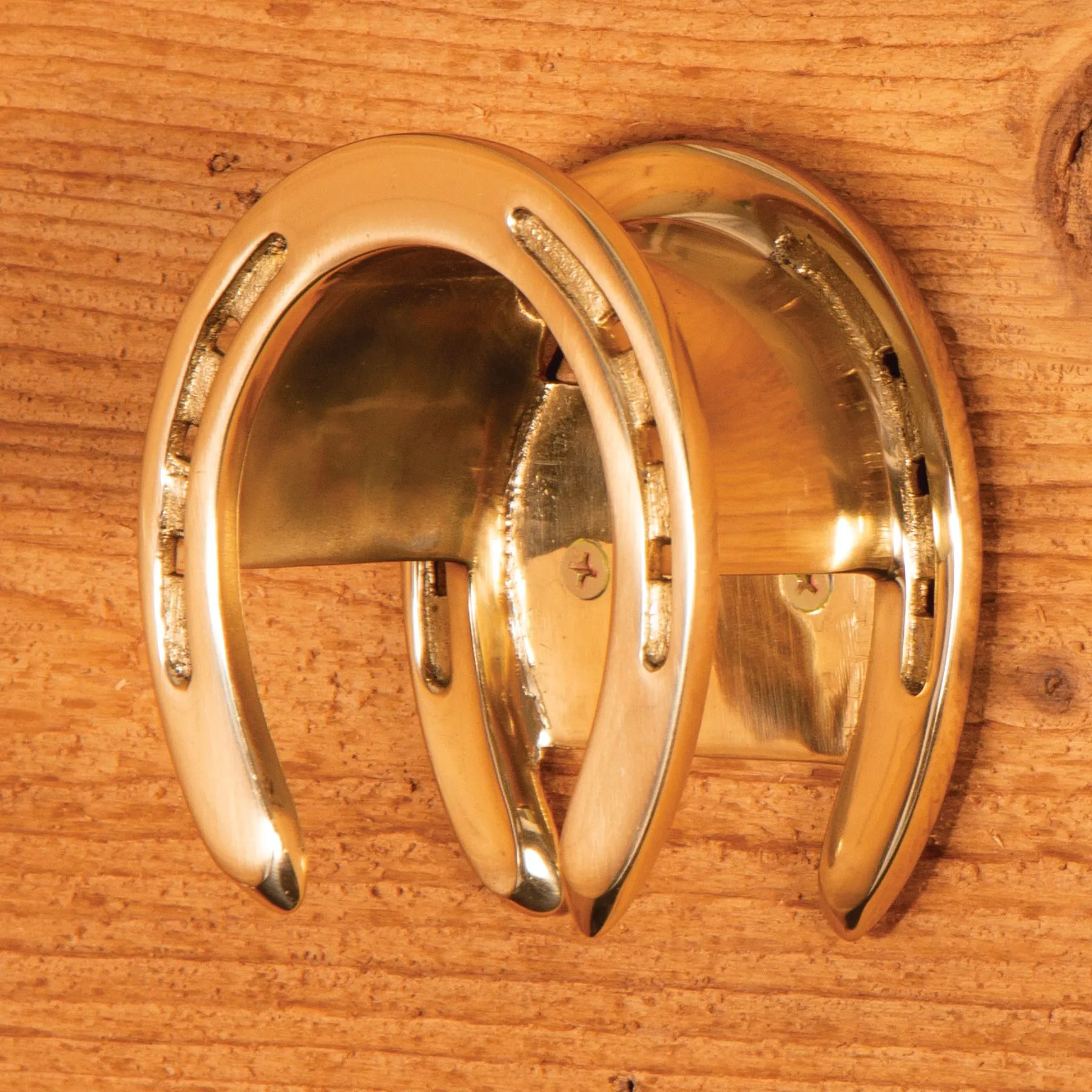 This beautiful, heavy solid brass double horseshoe bridle rack is the perfect accent piece to dress up your stall front or tack room.