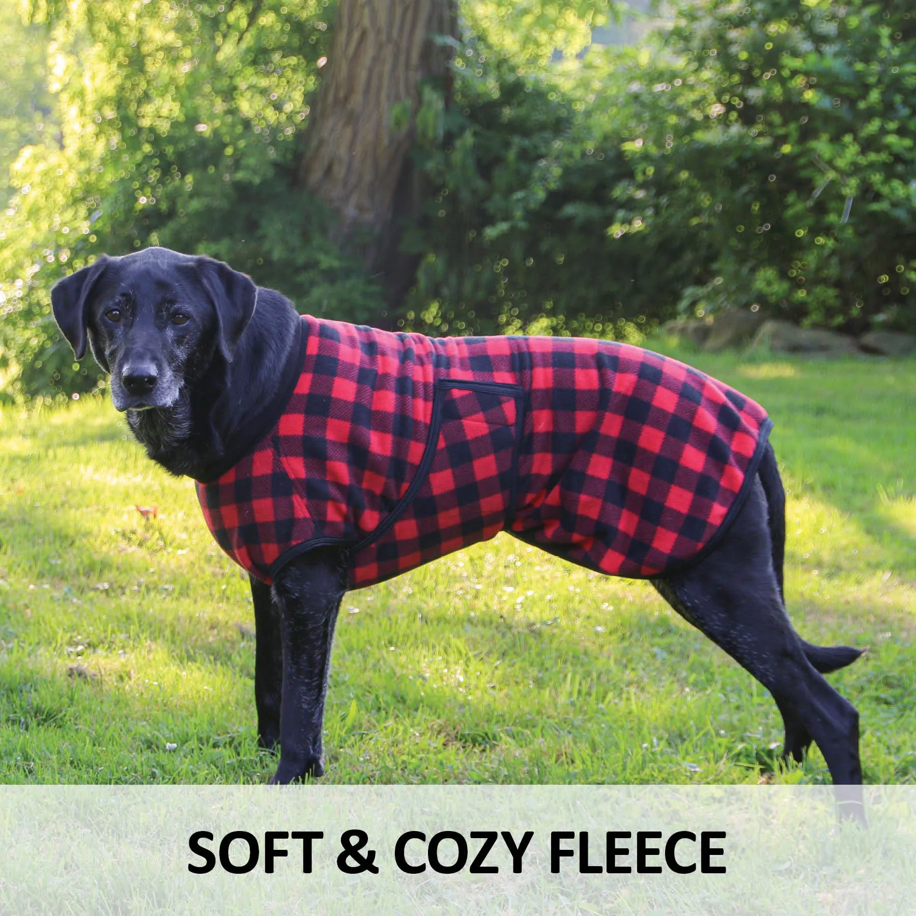 Super soft and cozy 260 gm Buffalo Red Plaid Fleece with fleece collar pulls over the head and wraps around each side, attaching with hook and loop closures. Great for adding a warmth layer under a blanket, drying after a bath or just a warming layer for inside.