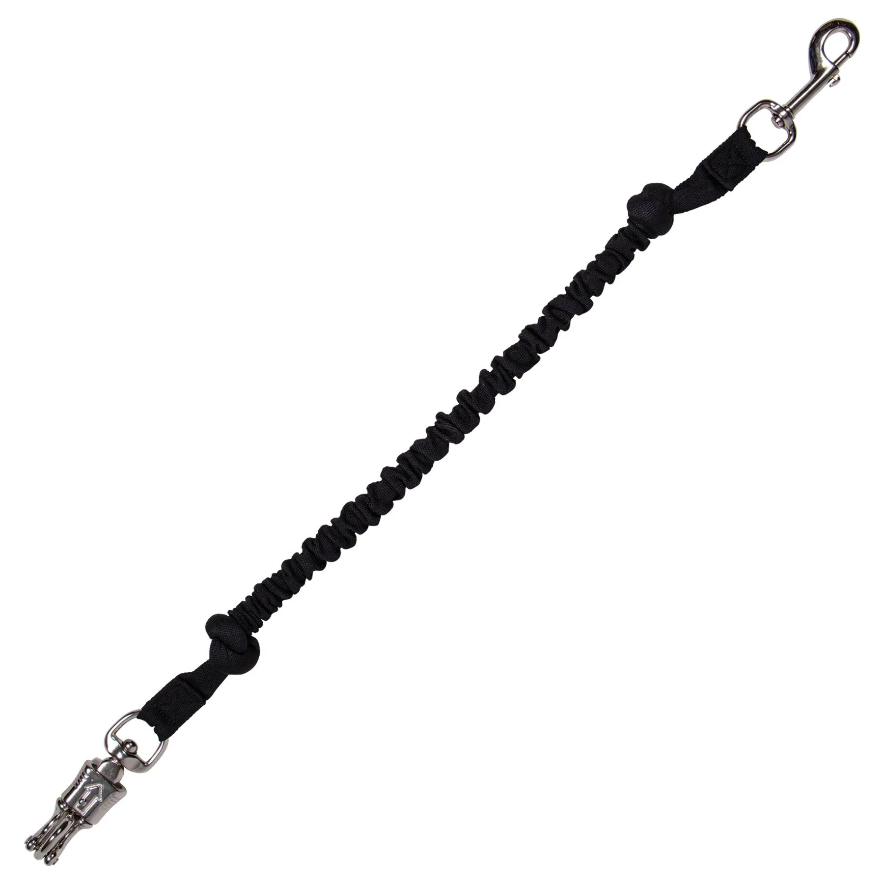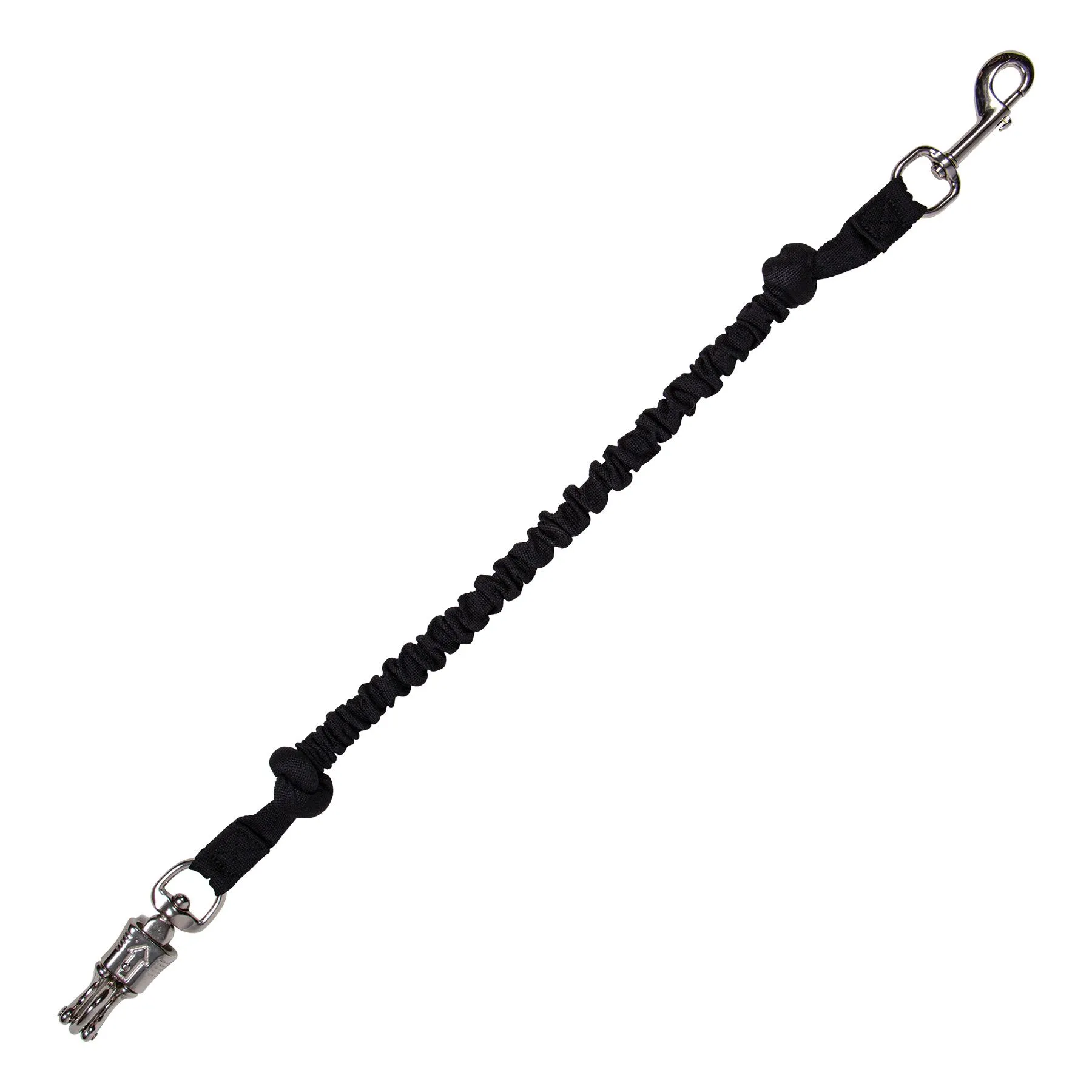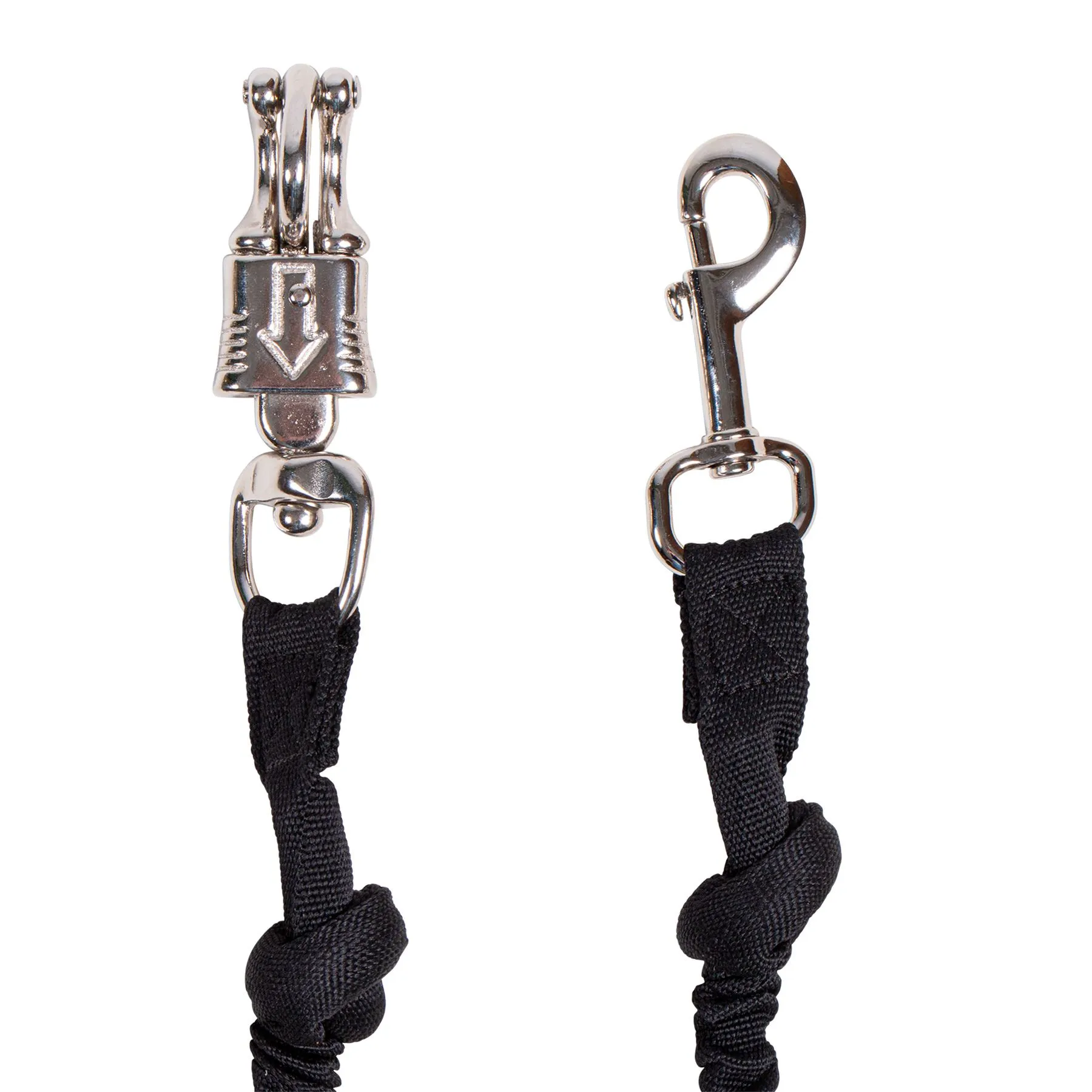 Safety stretch trailer tie with heavy poly webbing covering the bungee structure. Bungees are often good for horses that have a tendency to spook or panic because they offer some release when tension is applied so that your horse does not feel trapped.