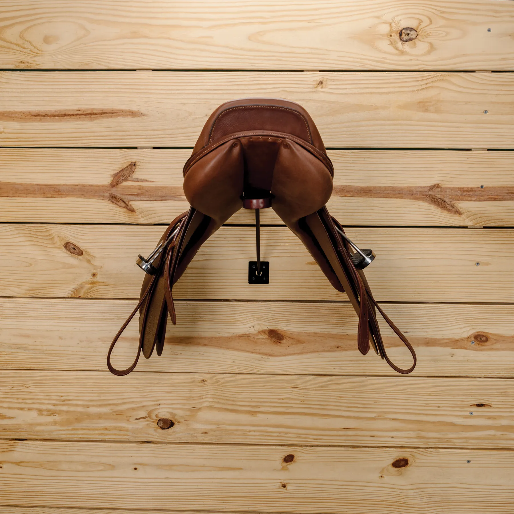 A beautiful combination of solid wood and metal, the Easy-Up® Collapsible Wooden Wall Mounted Saddle Rack will stand out in your tack room, aisle way, or grooming stall. The wooden saddle rack fits English and Dressage saddles and simply drops flat against the wall when not in use. Bring classic elegance into your barn with this beautiful rack.