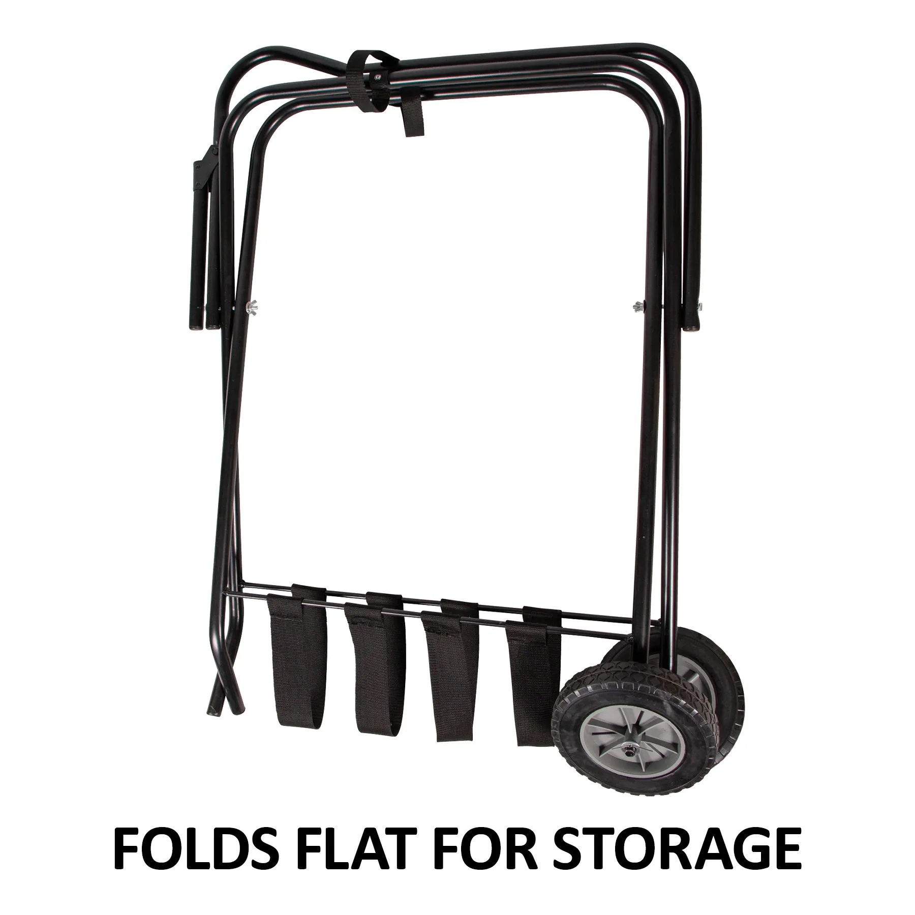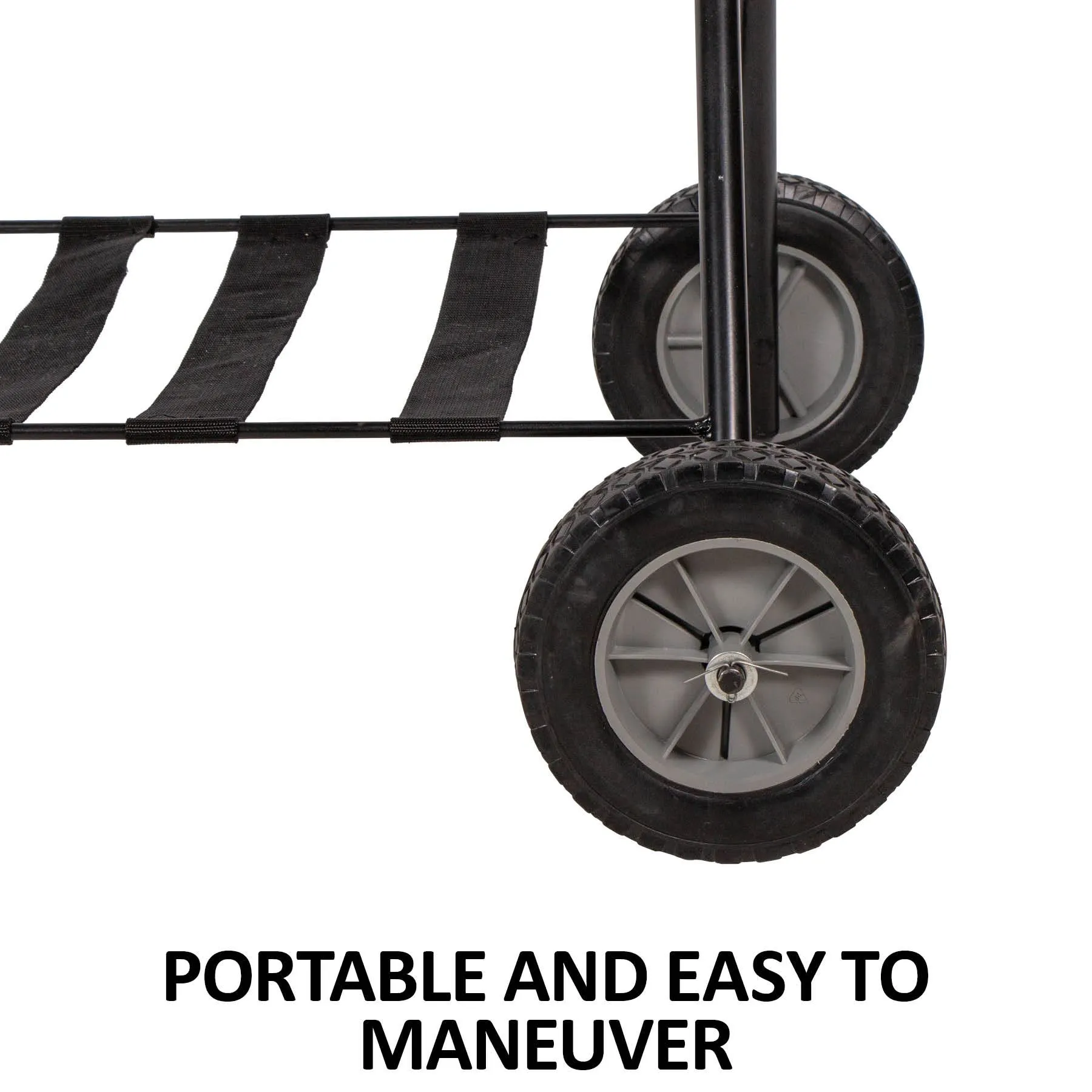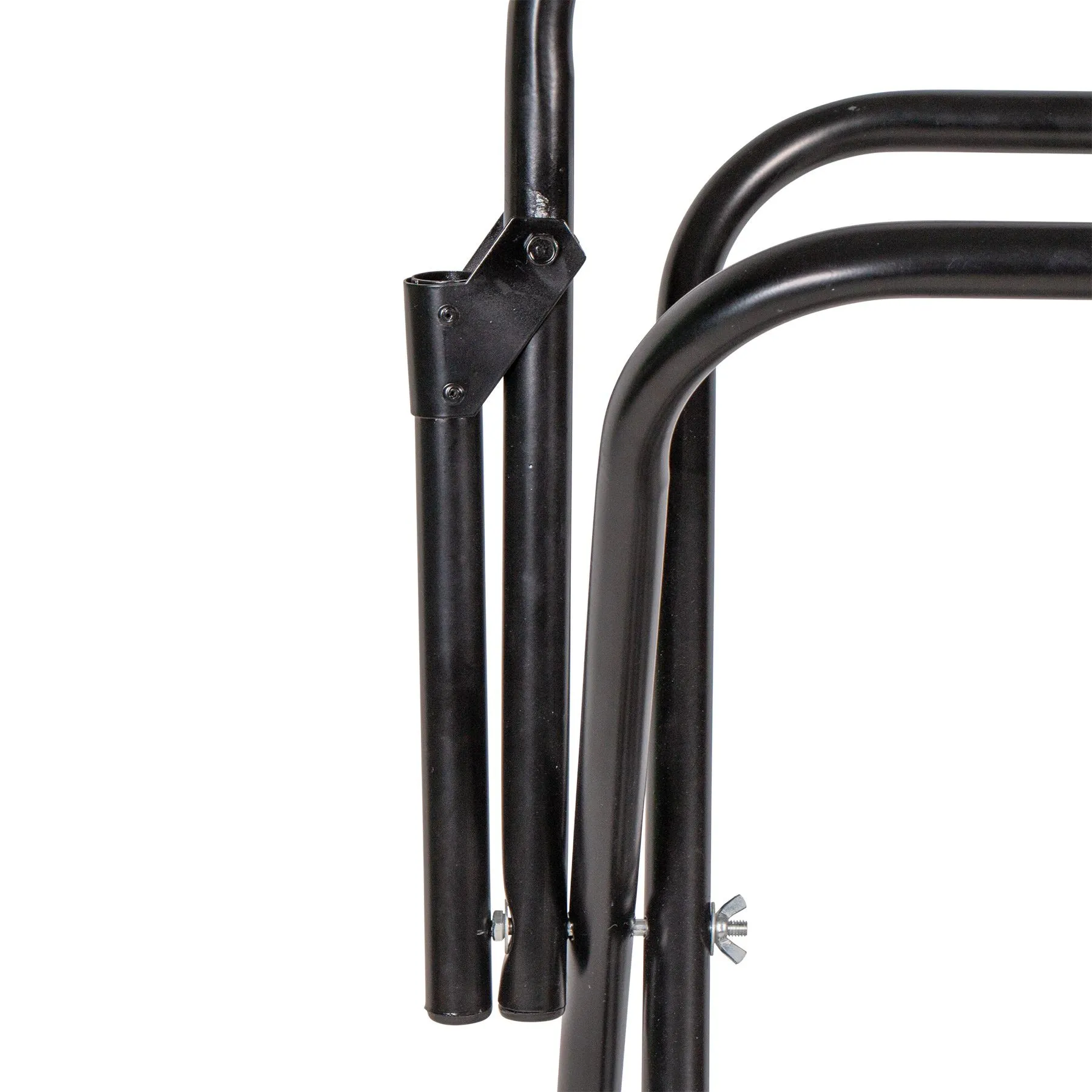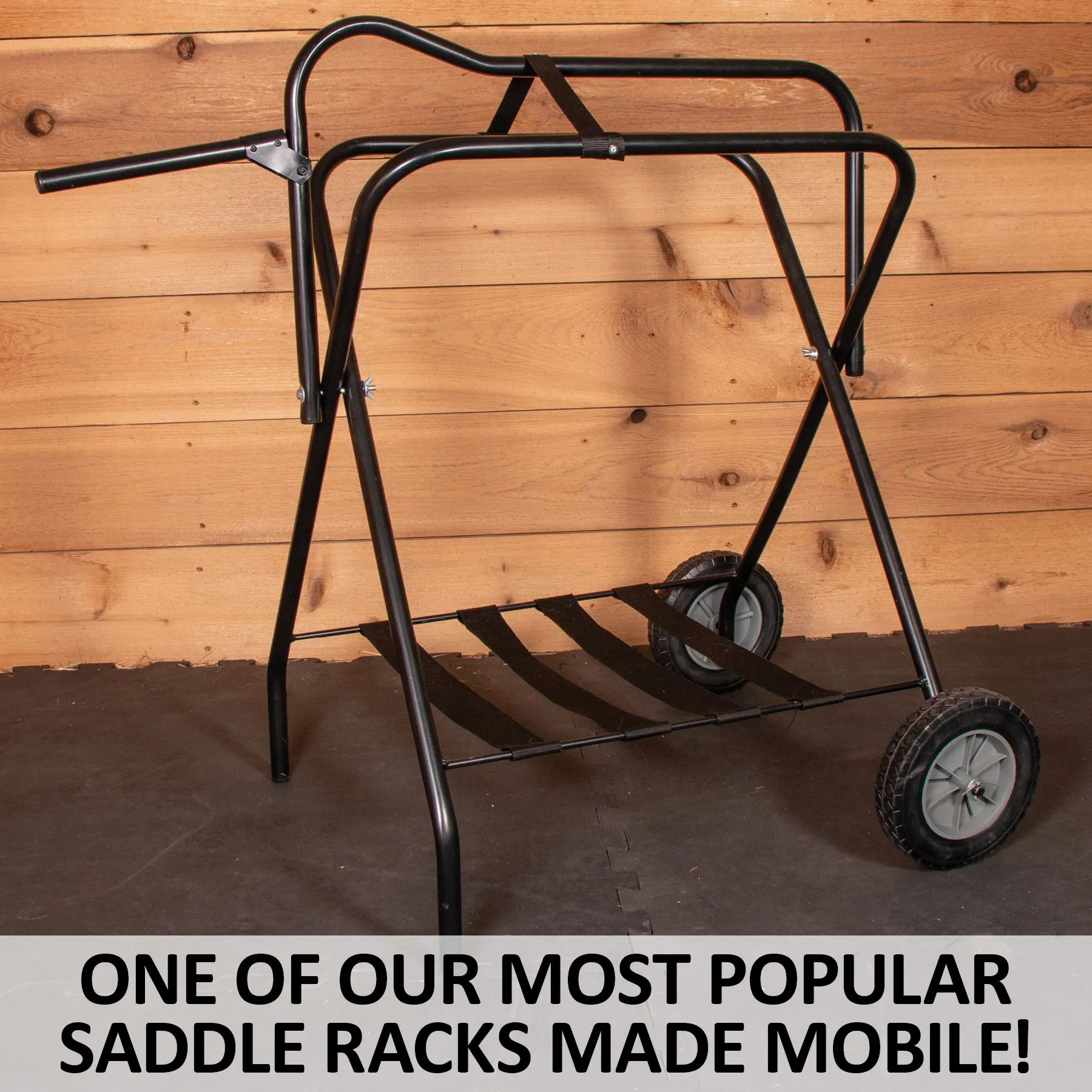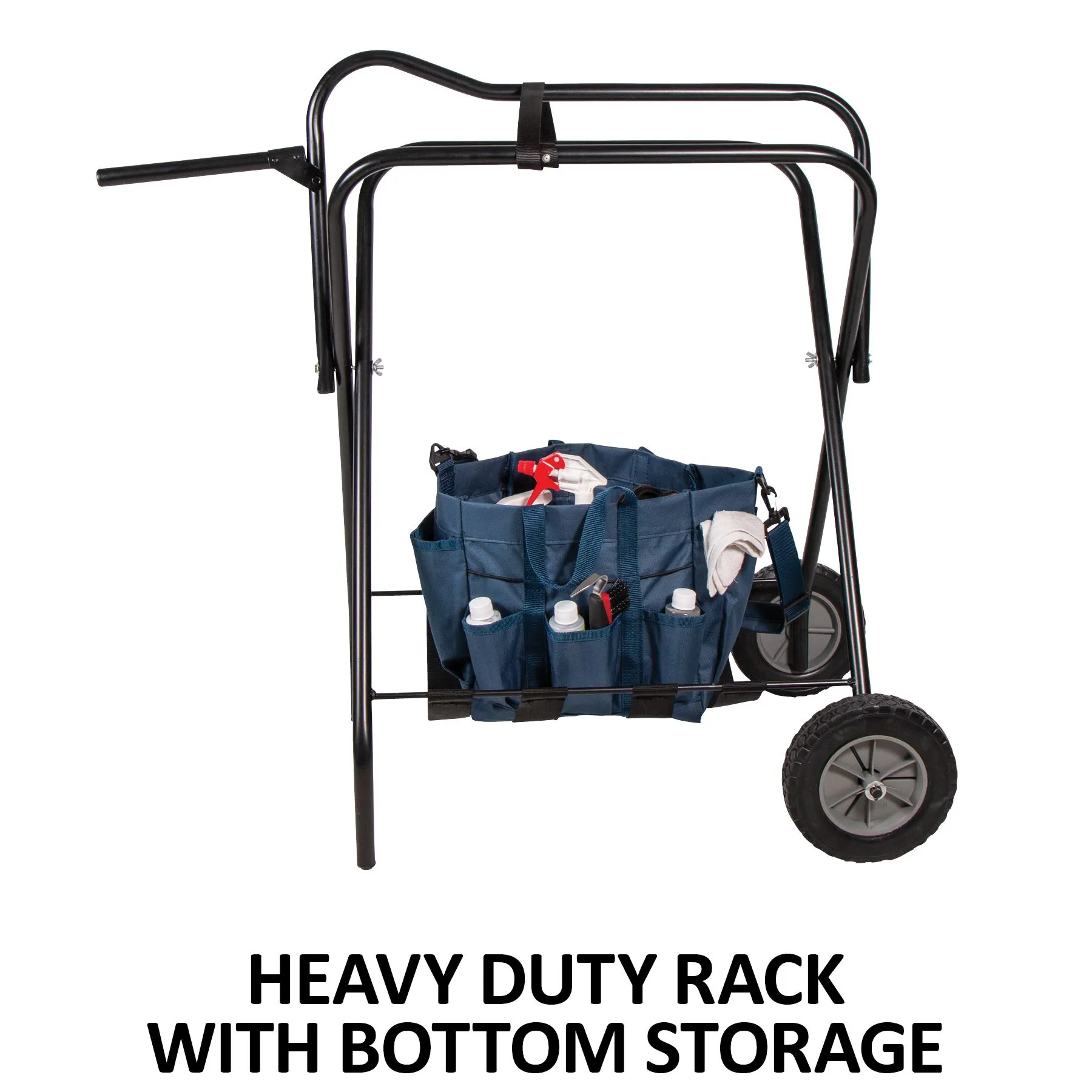 Make transporting your saddle a breeze with this saddle rack on wheels! Designed for both English and Western saddles, this portable rack effortlessly supports your tack wherever you need it. Constructed with 7/8″ heavy-duty tubing, this rack is built to last. Plus, with 8″ diameter all-terrain wheels and a 9 3/4″ L drop-down handle, you can easily maneuver your saddle. Store your extra gear, such as saddle pads or grooming bags, on the heavy-duty webbing straps at the bottom. When not in use, you can easily fold this portable saddle rack flat for storage.