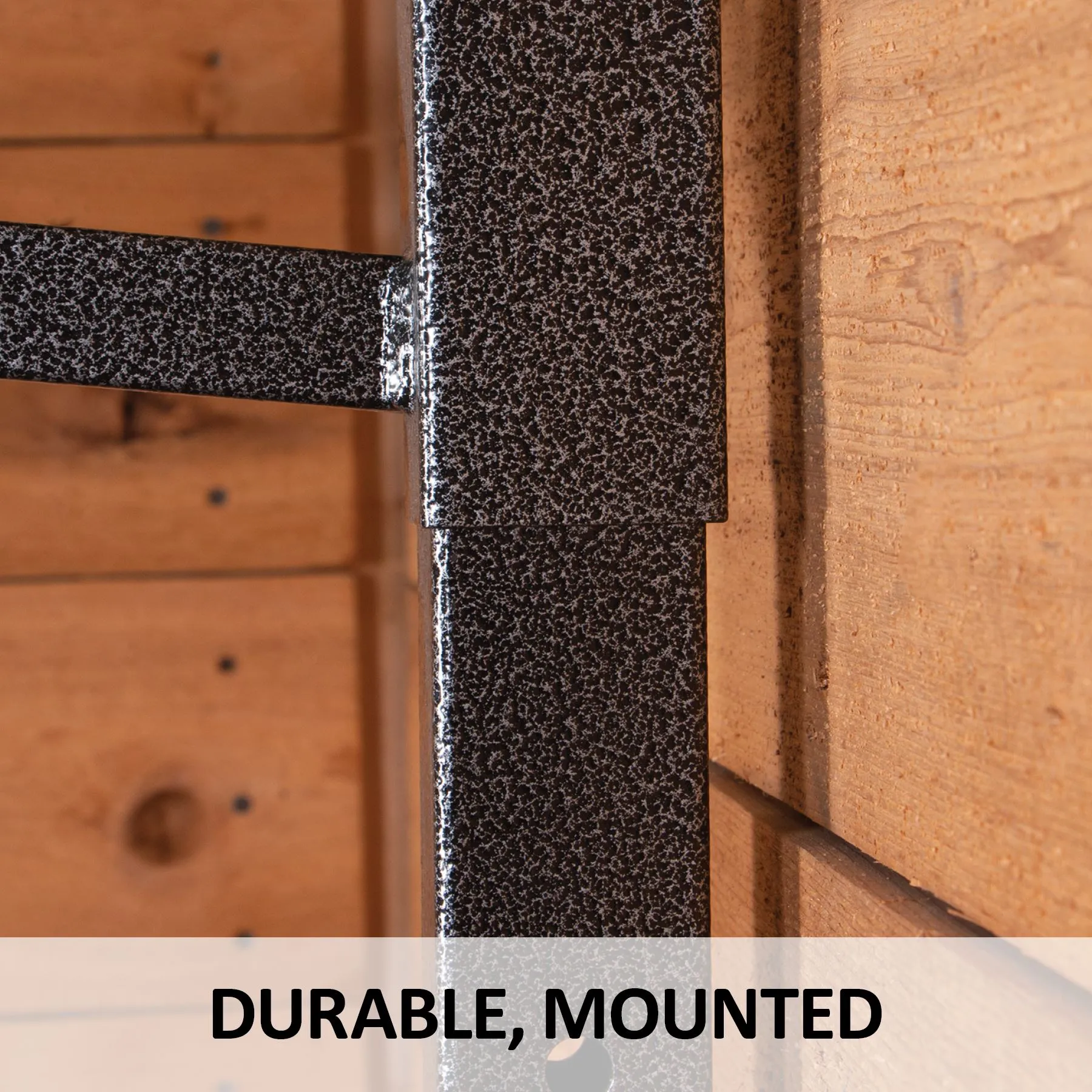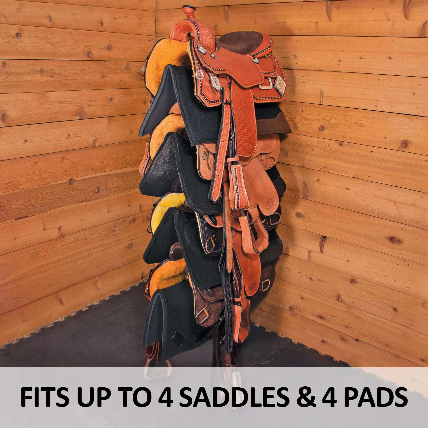 Incredibly durable, this mounted 4-tier saddle and pad rack with an adjustable pin lock system, allows the user to adjust the spacing of each rack. Can only fully alter spacing when 3 racks are used, with the fourth rack removed. Allows for adjusted space depending on how you prefer to organize your saddles and pads.