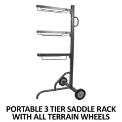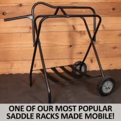 Our Easy-Up® Saddle Wagon holds a Western or English saddle with underneath storage for boots, grooming bags, buckets, etc. Made from durable 1″ tubing with a black powder coat finish. Total height to handle measures 46″, height from saddle rack to floor 31″.