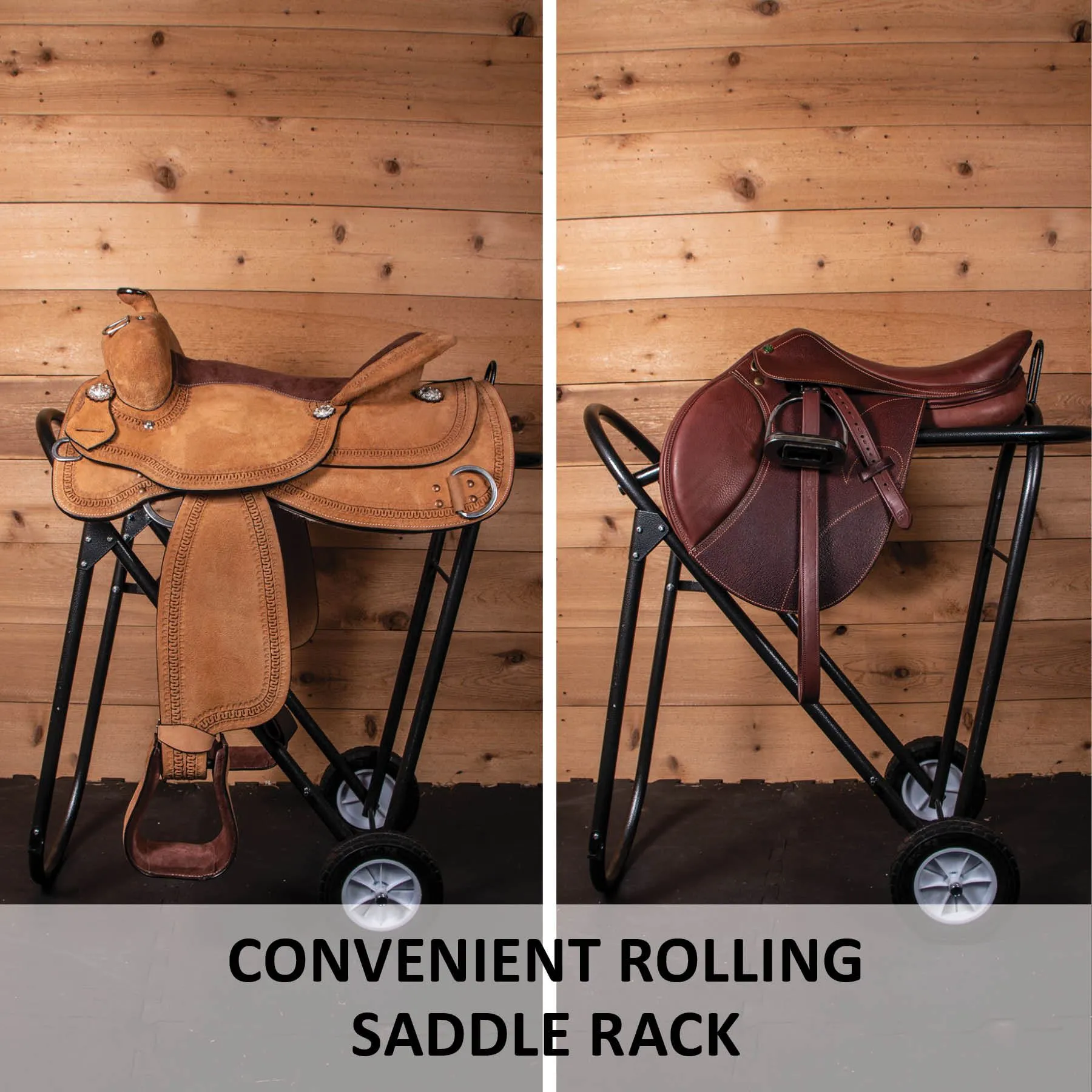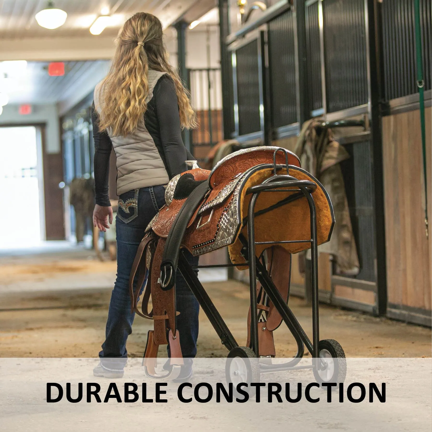 Perfect for storing saddles at home, or for easy transport from the trailer to stalls at a show. Note: Western saddles should be positioned with the cantle end against the front metal U joint.