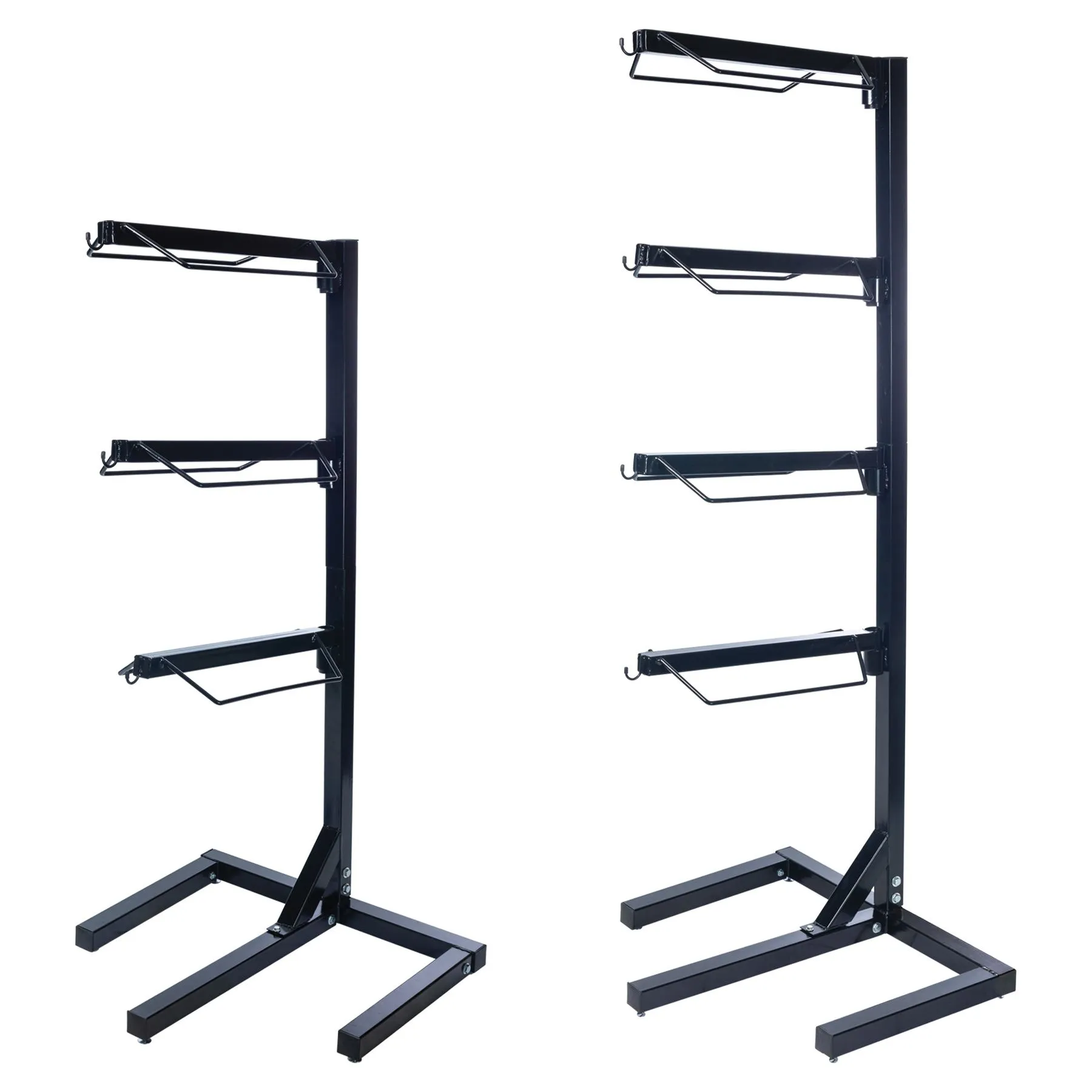 Easily access your saddles with this swivel saddle rack with tack hooks. No more hassle of moving other saddles or gear to reach the one you need. The swivel racks rotate left and right to fit English and Western saddles, giving you quick access to all your gear. The hooks on the front of each rack are perfect for hanging halters, bridles, martingales, and more. The 3-tier rack is 60″ high, while the 4-tier is 72″ high. The saddle rack spines are 25″ long and 10 1/4″ wide. The front hooks are 1 1/4″ wide.