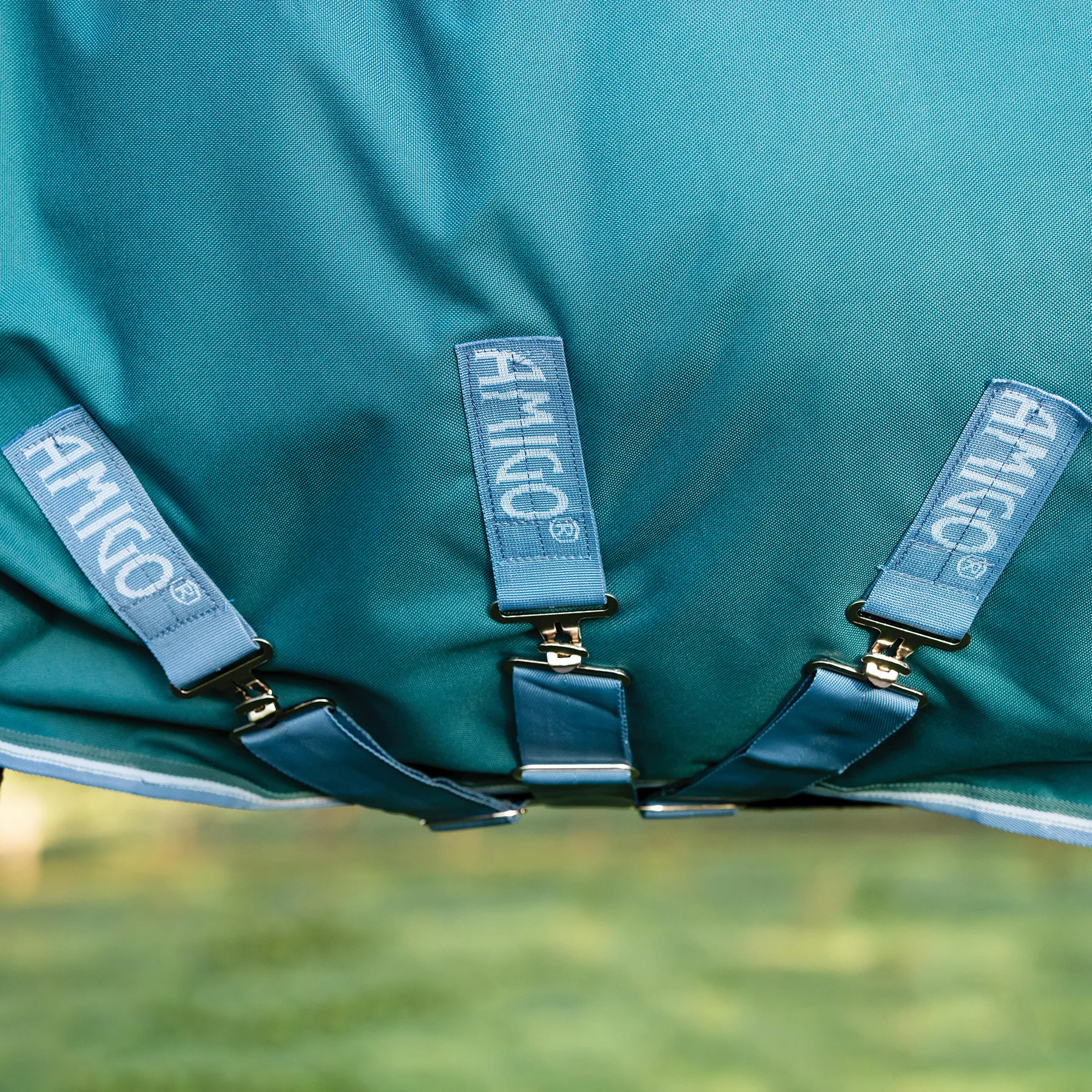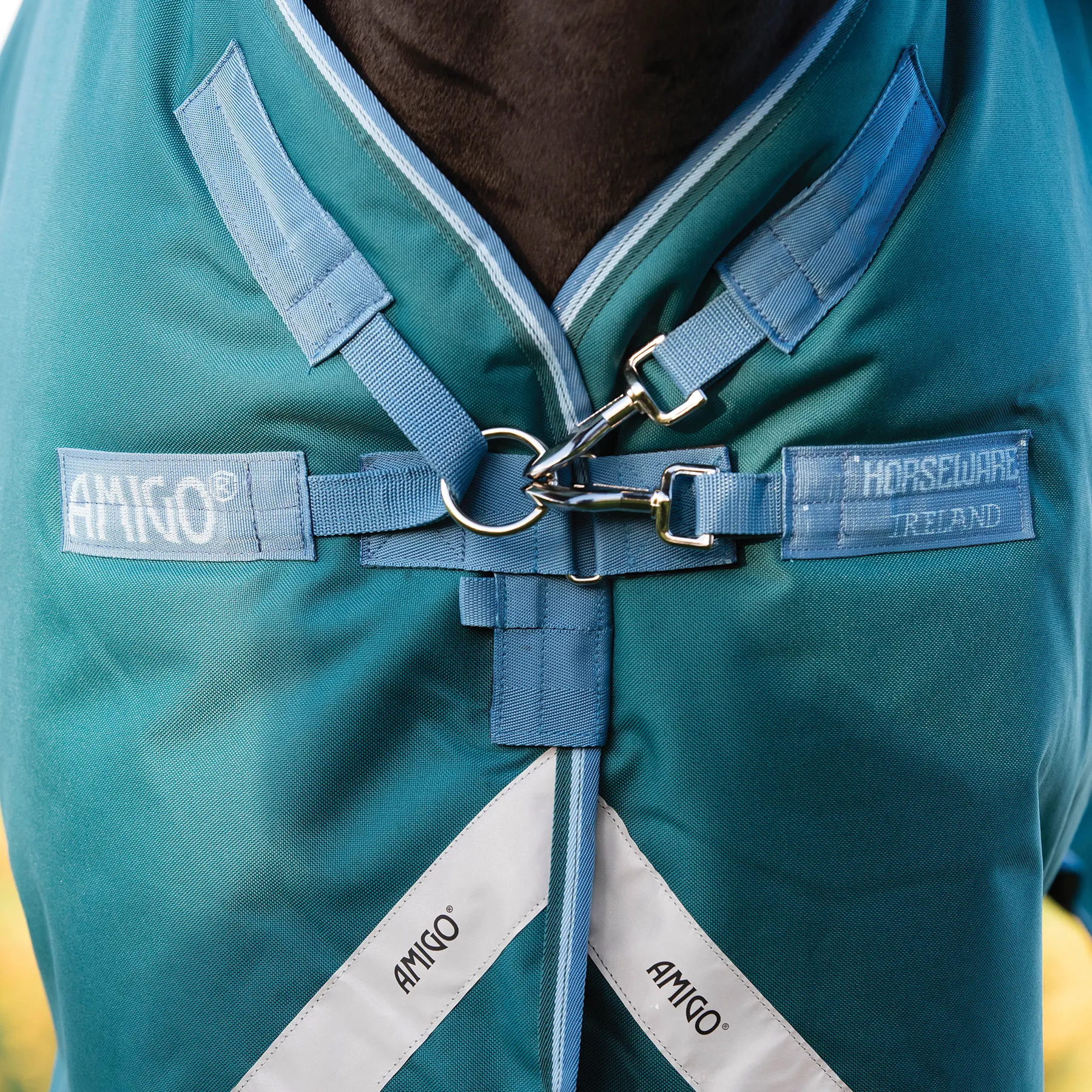 A heavyweight waterproof turnout blanket from Amigo® that’s designed to fit well and give you options to add a liner or remove the neck cover.